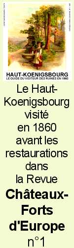 Commune : Orschwiller, arr. Sélestat-Erstein, cant. Sélestat Département : Bas-Rhin (67) Description : Haut-Koenigsbourg est le sujet principal de la revue des châteaux-forts n° 1, Haut-Koenigsbourg, Guide du visiteur des ruines en 1860. Monument suivant sur la même commune Liens : Images : Oui Informations touristiques : Oui Description du site : Oui Histoire : Oui Liens vers d'autres sites : Oui Site spécialisé : Oui Description : Site consacré au patrimoine architectural français. Y sont présentés de nombreux châteaux forts. Chaque monument est largement documenté et illustré : informations sur les conditions de visites, histoire, nombreuses photos. http://castrum.chez-alice.fr/revue_01.htm Images : Non Informations touristiques : Non Description du site : Non Histoire : Non Liens vers d'autres sites : Non Site spécialisé : Oui Description : Page présentant le numéro de la revue des Châteaux-Forts d'Europe consacré au château du Haut-Koenigsbourg. Images : Oui Informations touristiques : Oui Description du site : Oui Histoire : Oui Liens vers d'autres sites : Oui Site spécialisé : Non Description : Site répertoriant un certain nombre de châteaux. Informations sur les ouvertures au public, rapide historique et nombreuses illustrations http://www.haut-koenigsbourg.net/index.htm Images : Oui Informations touristiques : Oui Description du site : Oui Histoire : Oui Liens vers d'autres sites : Oui Site spécialisé : Oui Description : Site d'une école consacré au château du Haut-Koenigsbourg http://www.donjons-de-france.com/ Images : Oui Informations touristiques : Oui Description du site : Oui Histoire : Oui Liens vers d'autres sites : Oui Site spécialisé : Non Description : Site fournissant des informations diverses sur de nombreux châteaux en France et dans le sud de l'Angleterre une photo, un historique et des informations sur les possibilités de visites. Images : Oui Informations touristiques : Oui Description du site : Oui Histoire : Oui Liens vers d'autres sites : Non Site spécialisé : Non Description : Site des Monuments Nationaux. Présentation détaillée de quelques monuments, plus succinte pour d'autres : pour les trouver : cliquez sur le bouton "Visitez les Monuments" en haut de la page d'accueil. http://www.autour-des-chateaux.com Images : Oui Informations touristiques : Non Description du site : Oui Histoire : Oui Liens vers d'autres sites : Oui Site spécialisé : Oui Description : Site généraliste sur les châteaux fournissant des informations générales sur les châteaux, et quelques descriptions de grands monuments mais aussi de châteaux moins connus. Images : Oui Informations touristiques : Non Description du site : Oui Histoire : Oui Liens vers d'autres sites : Non Site spécialisé : Non Description : Site du pays de Barr et du Bernstein Images : Oui Informations touristiques : Non Description du site : Oui Histoire : Non Liens vers d'autres sites : Non Site spécialisé : Oui Description : Site d'images sur les châteaux forts d'Alsace en ruine et le Haut Koenigsbourg.